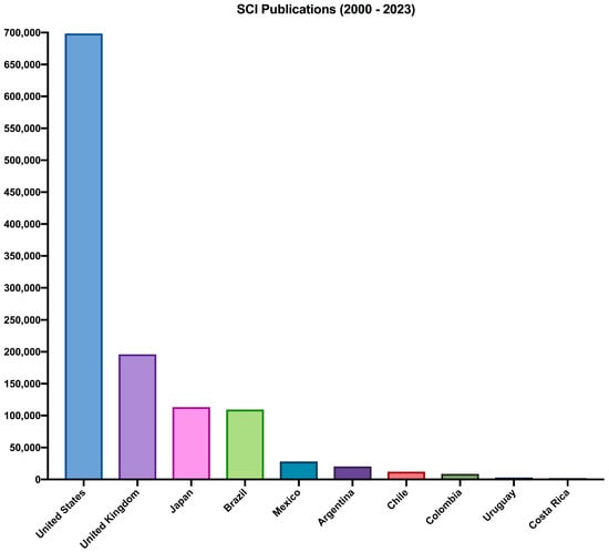 Total publications in biological and agricultural sciences per country from 2000–2023. Source: https://www.webofscience.com/wos/woscc/summary/aa61e6ed-7360-43a0-a395-38f0e77dfb1d-76f77d91/relevance/1 (accessed on 1 March 2023).