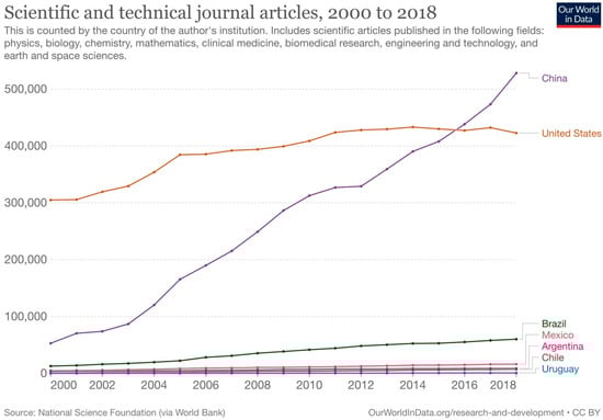 Scientific and technical journal articles from 2000 to 2018. Source: https://ourworldindata.org/research-and-development (accessed on 1 March 2023).