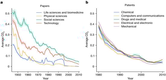 (a,b) Decline in the CD5 index over time, segregated according to papers ((a), n = 24,659,076) and patents ((b), n = 3,912,353). Shaded bands correspond to 95% confidence intervals. Source: https://www.nature.com/articles/s41586-022-05543-x#Sec9 (accessed on 1 March 2023).