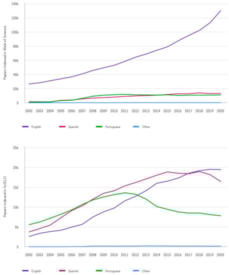 The language coverage of Web of Science (top) and SciELO (bottom). Source: https://clarivate.com/lp/latin-america-south-and-central-americamexico-and-the-caribbean/ (accessed on 1 March 2023).