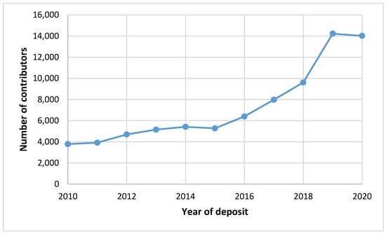 Since 2010, the number of contributors for all laboratories has continuously increased from 3787 in 2010 to 14,023 in 2020 (Figure 1).