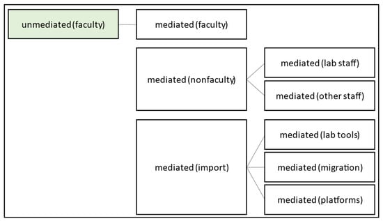 Input from other platforms accounts for 27% (2% from institutional repositories, 2% from publishers, and the other 23% are migration flows). Input from personal nonfaculty staff accounts for 13%, while the other 8% is input from library, laboratory, or university avatar accounts. Probably some unmediated deposits are in reality mediated faculty deposits (deposits by scientists of other scientists’ output), but based on our data, it is impossible to provide a good estimate of this part. Furthermore, it is not possible to make a reliable distinction between laboratory staff and other staff from the academic library or another service, or between laboratory staff and laboratory tools. Finally, it is important to keep in mind that these figures reflect the situation in 2020 and do not represent the whole HAL content.