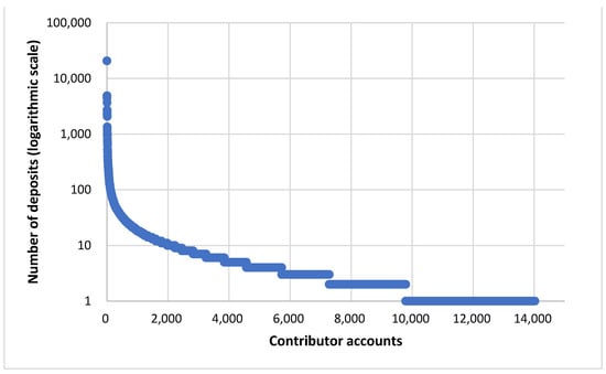 As mentioned above, the research has two methodological shortfalls. First, we counted events (deposits per laboratory per year). If a deposit (article, communication, etc.) has coauthors from two different laboratories from our sample, it will be counted twice (duplicates), which means that the absolute numbers are overestimated. However, a precise analysis of the 2020 events (166,939) shows that this systematic bias is not important (2869, or 1.7%). Second, we assessed the activity of each contributor’s account, but we did not assess each deposit. In other words, we cannot compare the metadata of authors with the contributor account, as performed by [,]. Thus far, our results are similar enough to those based on direct matching between the creator (author) and contributor fields to provide complementary, valid evidence to these former studies.