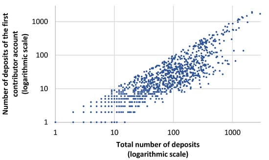 The 2020 sample consists of 1176 research laboratories, ranging from 1 to more than 100 contributors and from 1 to nearly 3000 deposits (median = 67). The correlation between the number of deposits and the number of contributors is 0.54. The higher the number of contributors, the higher the number of deposits in a given laboratory. Thus far, more noteworthy seems the relationship between the number of deposits of the whole laboratory and the number of deposits of the laboratory’s first contributor account, i.e., the contributor account with the highest number of deposits for this laboratory; here, the correlation coefficient is 0.86. In other words, while the number of contributors is relevant, the importance of the first contributor is even more relevant for laboratories’ total number of deposits on HAL. Figure 5 shows this strong correlation for the whole sample of 1176 research laboratories.