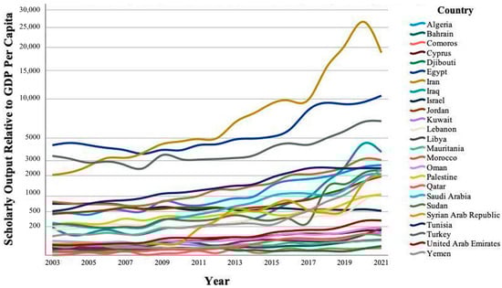 Scholarly outputs relative to GDP per capita by year by country.