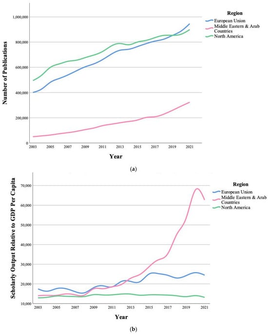 (a) Scholarly outputs by year by region. (b) Scholarly output relative to GDP per capita by year by region.