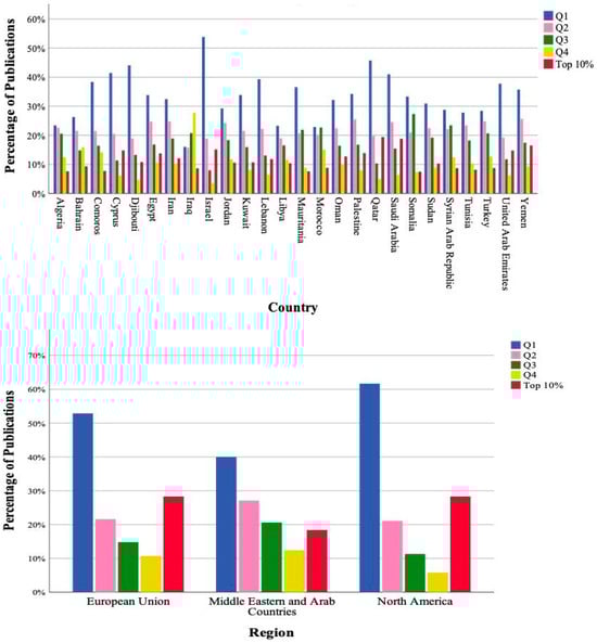 Supplementary Table S2 presents data on research excellence measured by the percentage of scholarly outputs published in top-ranked Scopus journals for various countries. Figure 3 illustrates the percentages categorized by country and by region. The results show that some countries have notably high percentages of scholarly outputs in Q1 of Scopus journals. Israel has 53.82% of its scholarly output being published in Q1 journals. Similarly, Cyprus (41.48%), Saudi Arabia (41%), Qatar (45.73%), and Djibouti (44.09%) have a large proportion of scholarly outputs in top-tier Q1 journals. Several countries exhibit a relatively balanced distribution across different journal tiers, implying that they have a diverse publishing portfolio in terms of journal rankings. For instance, Algeria, Jordan, Libya, and Morocco demonstrate relatively similar percentages across the Q1, Q2, and Q3 categories. However, a few countries have a higher proportion of their scholarly outputs in lower-ranked journals, such as Iraq with 27.76% of its scholarly output classified under the Q4 tier. Overall, the Middle Eastern and Arab countries have a lower percentage of scholarly output published in the highest impact journals (both the top 10% and the top 25% categories) compared to the European Union and North America. This indicates a relative difference in research quality and visibility in the most prestigious academic scholarly outputs between these regions.