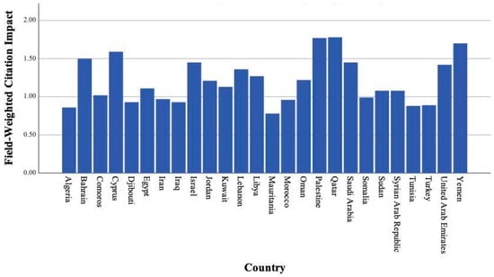We also looked into the top 10% citation (which shows how well a researcher’s work performs compared to their peers in terms of citation impact) and average citations per publication (which provides an overall measure of the impact of a researcher’s work) (Table 2). Further, field-weighted citation impact (FWCI) was analyzed as a measure of the impact or influence of a specific article, journal, or author within a particular field of study. Figure 4 presents the FWCI for each county. It is evident that the Middle Eastern and Arab countries have the lowest impact metrics among the three regions.