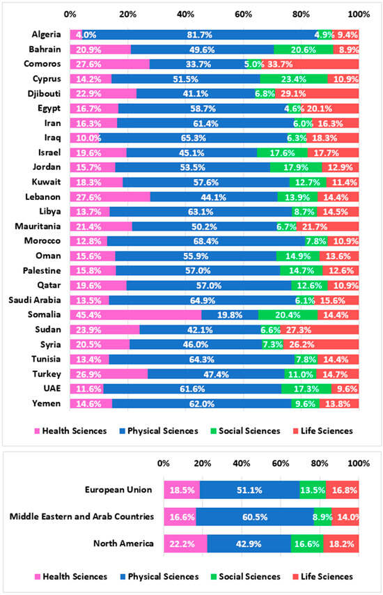 We also utilized other subject area categories and classifications in Scopus, which included four categories: physical sciences, health sciences, social sciences, and life sciences. Supplementary Table S4 presents the number of scholarly outputs in each of the four Scopus’s subject areas for each country. Figure 5 showcases the percentage of scholarly outputs across each of Scopus’s subject domains for every country and region. The field of physical sciences took the lead as the most prevalent subject area in the Middel Eastern and Arab region, comprising about 60.5% of the research emphasis. Conversely, social sciences garnered comparatively less research attention, making up approximately 8.9% of the focus.