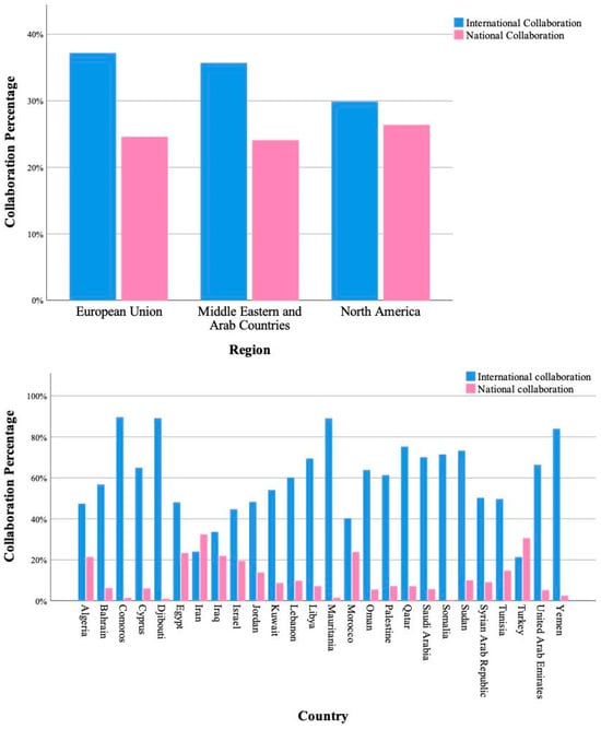 The European Union has the highest percentage of international collaboration at 37.2%, followed closely by Middle Eastern and Arab countries at 35.7%, and then North America at 29.9%. As per the national collaboration, North America has the highest percentage at 26.4%, followed by the European Union at 24.6%, and then Middle Eastern and Arab countries at 24.1%.