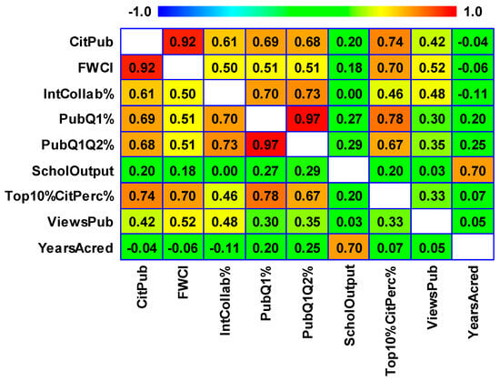 The Pearson product-moment correlation method for the nine feature variables considered in this study (Figure 1) showed, in general, lower correlations between scholarly output and the other chosen metrics considered in this study. This highlights that the length (in years) of institutional accreditation, a Chilean parameter used to quantify university quality assurance, is only correlated to scholarly output (r = 0.70 in Pearson product-moment correlation) without showing any significant correlation with respect to the quality and impact of publications. Also, from Figure 1, it can be appreciated that the years of institutional accreditation not only showed a lower correlation (near to zero) with features related to quality, but also in some cases negative values, as in citations per publications, field-weighted citation impact, and international collaboration.