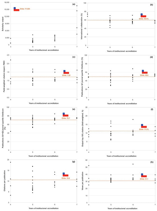 The 29 Chilean universities under study, with length of institutional accreditation ranging from 4 to 7 years, have different research performances when analyzing various metrics. As shown in Figure 2, there is a huge dispersion in research performances when comparing the values of the metrics analyzed for each university with respect to national levels. In addition, the only variable that correlates well with the institutional accreditation (length) is the scholarly output, whereas the other seven metrics that measure research quality and impact do not show this behavior. In fact, a positive correlation was found between the years of institutional accreditation and scholarly output.