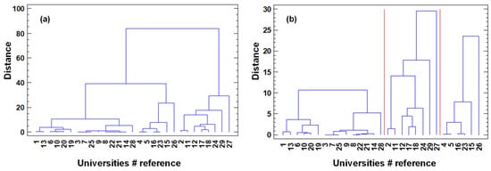 Dendrogram plots representing the hierarchical clustering (using squared Euclidean distance and Ward’s criterion) were first built considering one cluster for the selected feature variables, i.e., international collaboration (%), field-weighted citation impact, and publications in the top 10% citation percentile (field-weighted) are shown in Figure 3a. The 29 universities were also grouped into three clusters with a different number of associated institutions (see Figure 3b). Cluster 1 includes 15 universities (1, 13, 6, 10, 20, 19, 3, 7, 25, 9, 8, 22, 21, 14, and 28), cluster 2 eight universities (2, 11, 12, 17, 18, 24, 29, and 27), and cluster 3 six universities (4, 5, 16, 23, 15 and 26). It can be concluded from Figure 3 that the four universities with the highest length of institutional accreditation (7 years; institutions referenced as 26, 27, 28, and 29) are distributed among the three different clusters. The same behavior is observed when analyzing those universities accredited with the lower lengths of institutional accreditation (4 and 5 years).