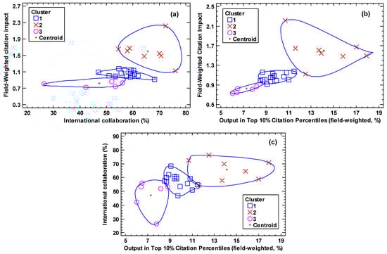 Clusters in scatter plots for the three selected metrics used in the evaluation of research performance. (a) international collaboration (%), (b) field-weighted citation impact and (c) output in top 10% citation percentile (field-weighted, %).