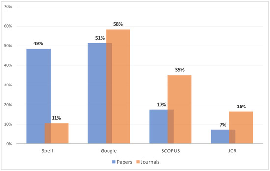 The second advantage of Spell lies in its scope in indexing journals researchers in the Administration, Accounting, and Tourism fields publish in. As shown in Figure 2, Spell indexes 11% of journals that have received publications from researchers in the field; however, these journals account for 49% of the entire volume of articles produced in the field. Although Scopus and the JCR of Web of Science present higher rates of journals (35% and 16%, respectively), their volume of published articles is much lower (17% and 7%, respectively). Google Scholar, which indexes 58% of all publications, only exceeds Spell’s publication volume by two percentage points. Although Google Scholar has greater coverage than Spell, its use as an impact indicator is discouraged in many cases due to limitations observed in its indicators [4].
