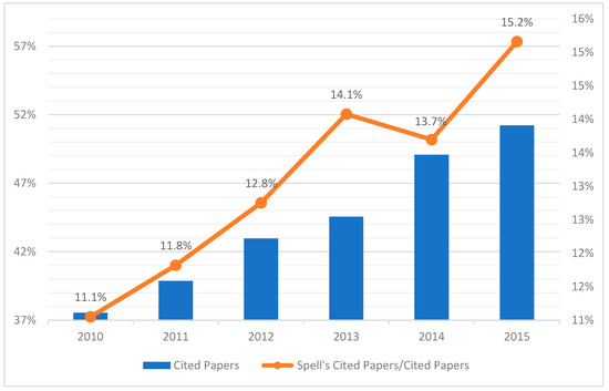 The citation rate recorded for articles belonging to the Business Administration, Accounting, and Tourism fields, which were published in journals listed in the Spell database has been constantly increasing in Brazil, as shown in Figure 3. A little more than 37% of citations observed in 2010 referred to articles in journals, whereas the total citation rate recorded in 2015 has increased to 52%. This outcome has indicated a trend to increasingly cite peer-reviewed documents to the detriment of books or other document types.