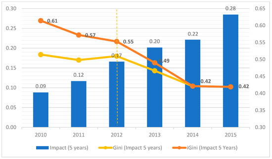 Apparently, “the richest” journals in terms of citations are not proportionally getting “richer”, which is the reason why we must carefully analyze whether Spell has reduced the Mathew effect on journal citations. Since such assessments cannot be conducted with aggregate indices such as Gini, we used the measurement tool recently formulated by Liao [28], iGini, whose trend is also shown in Figure 4. It is worth emphasizing that Gini corresponds to the exact sum of iGini; however, the Gini excludes cases presenting value 0, which is not the case for iGini calculation. This is the reason why iGini recorded higher values than Gini between 2010 and 2012. These journals without citations were listed in the database; therefore, they could not be featured as omitted cases; thus, they were included in the analysis applied to the Spell effect on reducing the inequality of citations.