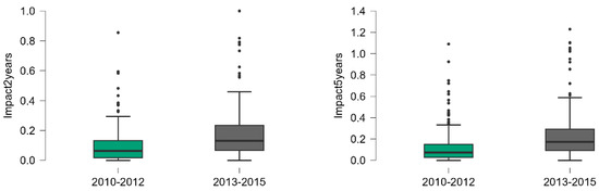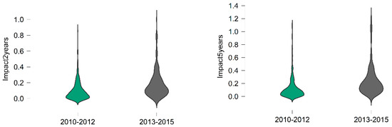 Table 1 also shows that citation impact grew in all quartiles (25%, 50%, 75%). However, growth was more remarkable precisely in the lower quartiles. The lowest inequality of citations observed between the evaluated periods is highlighted in Figure 5, which depicts the distribution of the 2-year (violin chart on the left) and 5-year (on the right) impacts. A greater volume of journals recorded lower impact values in 2010–2012; however, this volume decreased in 2013–2015, due to a higher density of cases in intermediate portions of journals listed in the database. Figure 6 corroborates these results, as there is an increase in both the median of the 2-year impact (from 0.065 to 0.131) and the 5-year impact (from 0.073 to 0.172). Thus, Spell’s mean impact has shown an increase in the number of citations recorded for documents between the analyzed periods, whereas iGini has evidenced whether such an increase was better distributed.