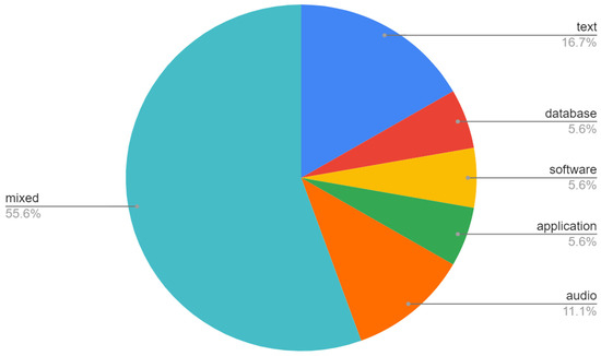From the research sample, the authors collected 123 objects (108 from OpenAire, 13 from DABAR, 2 from CROSSDA) stored as datasets, but only 20% were actual datasets, and the rest were research papers. Among the 26 actual datasets retrieved, the majority were mixed (55.6% were numeric and textual data). Figure 1 shows the types of repositories where it is evident that the largest types of dataset are mixed data that contain both numerical and textual data. The second dataset represented in the repository are textual data with 16.7% and audio data with 11.1%. With the same percentage of 5.6%, repositories represented databases, software, and applications.