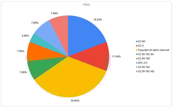 Almost all data are openly accessible (88.5%); 3.8% of the data have limited access, and 7.7% of the data are not openly accessible. Although most of the datasets are open access, there are still some restrictions on reuse. Figure 2 shows a representation of the licences assigned to the repository datasets that were analysed. Most datasets have copyright licence with all rights reserved (34.62%). CC BY is one of the least restrictive licences, represented in 20% of the datasets and the second most popular licence in this sample, with 19.23%. Only 11.54% of the datasets are marked with CCO, which serves as a public domain dedication tool and is the most suitable for research data. The CC BY NC ND, CC BY NC, CC BY ND, and CC BY NC SA licences are represented in 7.69% of the datasets, while GPL-3.0 is assigned to 3.85% of the datasets.