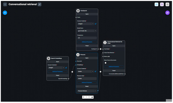In the second part of the research, our approach was mainly based on testing available tools for the customisation of the chat model. The preparation stage involved the extensive research of available solutions for designing chatbots trained with user-defined content. The fundamental requirement was to find a low-code or no-code method of designing and developing custom applications. The low-code approach enables users to design and create applications using intuitive graphical tools, thus reducing the traditional coding requirements. Users with basic coding skills can use low-code tools to develop and integrate custom applications. In comparison, no-code approaches eliminate the need for programming knowledge, allowing nontechnical users to develop applications without writing any code. The proposed method allows a broader range of users to participate in building similar solutions.