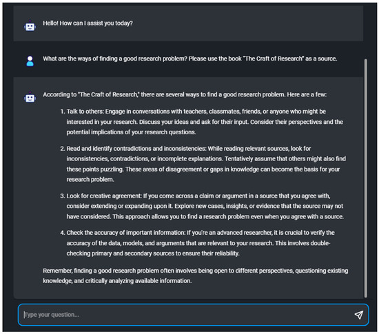Considering the role of academic libraries in this rapidly changing information landscape, discussions have focused on understanding the future possibilities of AI text generators and the possible impact on library services. The limitations concerning training data, bias, and false information are emphasised as concepts crucial for information professionals [6]. The natural language processing abilities of ChatGPT could be used to improve search and discovery, reference and information services, cataloguing, metadata generation, and content creation [7]. Suggested applications of ChatGPT in academic libraries include the creation of virtual assistants, complementing reference services (such as a simulated reference librarian), improving user experience, the selective dissemination of information, optimising collection development, and copy cataloguing. ChatGPT technology offers possibilities for integration into library discovery tools and simplifying repetitive aspects of the research process. Academic librarians can use the content generation abilities of the tool in lesson planning and the creation of open educational resources (OER) [8,9].