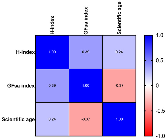 Pearson correlation (r) demonstrating a negative association between GFsa© and “scientific age” and a positive correlation between H-index and “scientific age”. Moreover, a positive correlation was observed between both indices (H-index and GFsa©).
