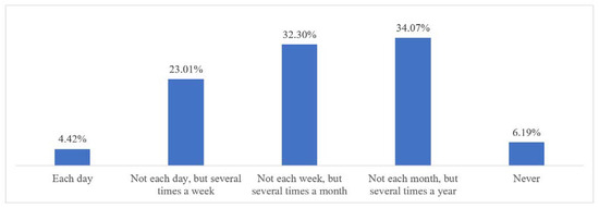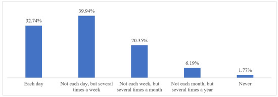 The majority of respondents very often read and download scientific works via the Internet (Figure 1). Overall, 32.74% of respondents download scientific works every day, and 38.94% download works several times a week. Only 1.77% of respondents never use the Internet to read or download scientific papers. These data tell us that among the respondents, the Internet is widely used for reading and downloading scientific papers.