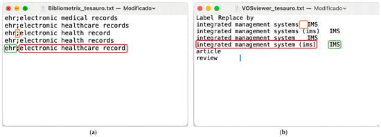 Regarding disambiguation in the generation of semantic maps and trending topics, text files in the .txt format were generated for both tools used, Bibliometrix and VOSviewer. Each tool has a different disambiguation format, as detailed in Figure 2. For Bibliometrix, the disambiguation file has no header and is a plain text file with semicolon-delimited terms (orange legend in Figure 2). The initial column contains the term that will be displayed in the semantic map (green legend in Figure 2), and the second column, after the semicolon, contains the original term (red legend in Figure 2). In the provided example, all variations of “ehr” (electronic health record), including singular and plural forms, were merged into a single term (see Figure 2a).