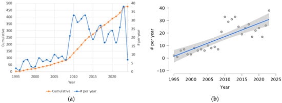 Figure 3a illustrates the temporal distribution of scientific publications on the topic of interest (blue series: annual production, orange series: cumulative production), over 29 years from 1995 to 2023. A notable increase in scientific productivity was observed from 2009, sustained until 2014, with a total of 172 articles representing 36.1% of the total selected records (). This period of high productivity contrasts with the period before 2009, where publications accounted for 17.4%, which indicates an incremental trend during that time. Between 2015 and 2021, a deceleration in scientific production of 4.6 percentage points is evident compared to the peak period. Following this decline, there was an increase in the rate of scientific production in 2022 and 2023, with 38 publications recorded in the latter year, the highest number in the entire analyzed period. The publication growth rate is 11.09% (calculated using the Biblioshiny tool from the Bibliometrix package in R), excluding 2024 only for this result to avoid bias. As of the date of this study, seven documents for 2024 were reported from the Scopus Database. Figure 3b analyzes the linear growth trend of the research, supported by Kendall’s correlation test, with the hypothesis of a positive growth rate (p < 0.001) at high significance (see Table 1).