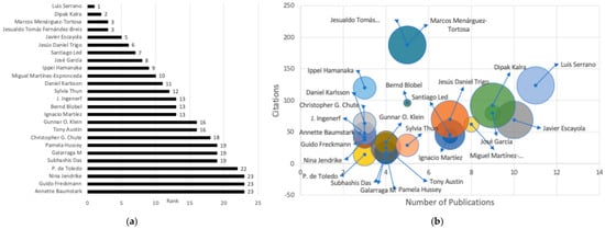 Global ranking of the 25 most productive authors in the database, (a) rank assigned by U-index, (b) global analysis of authors by productivity (number of publications), acceptance (citations), and impact (H-index).