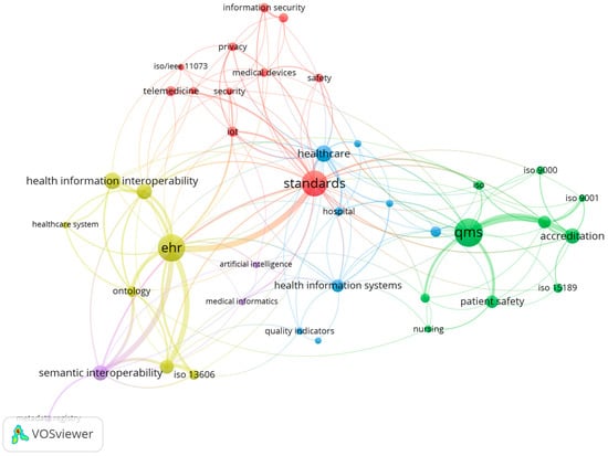 - The centrality of ISO standards: ISO standards, particularly ISO 9000, ISO 9001, and ISO 15189, occupy a central position in the network, indicating their fundamental importance in healthcare standardization processes.