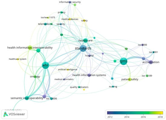 In Figure 10, the topic “patient safety” has experienced notable growth, especially from 2010 onwards. This reflects an increased awareness of the importance of ensuring patient safety in all aspects of healthcare, including the use of information technologies. The rise of “telemedicine” and “artificial intelligence” is evident, particularly from 2014 onwards. This reflects the progressive adoption of digital technologies and artificial intelligence in healthcare, driven in part by the need to improve the efficiency, accessibility, and accuracy of health services. The increase in the frequency of the term “data security” from 2016 suggests a significant concern for the protection of patient data and the security of health information systems in the digital age. Topics related to ISO standards, such as “ISO 9000,” “ISO 9001,” and “ISO 13606,” have maintained a constant presence, indicating the importance of having regulatory and quality frameworks in the development and use of health information technologies. Finally, the term “medical informatics” has persisted, indicating that it remains a fundamental area in the research and development of information technologies for health. All the above is consistent with the analysis initiated in Figure 9.