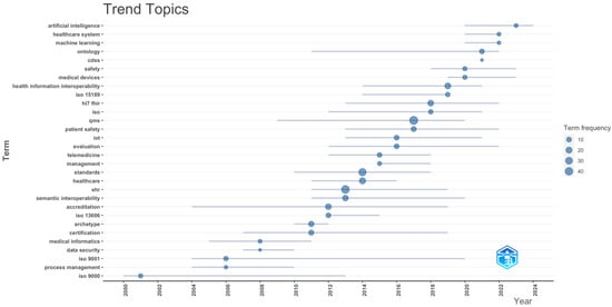 To reinforce the conceptualization of the evolution of research in ISO and healthcare systems, Figure 10 analyzes trending topics over more than two decades. The size of the circle represents the frequency of appearance of a keyword, while the horizontal bar indicates the period between the first and third quartile of publication years. A generalized growth is observed in most topics, indicating an increase in research and publication in these areas. Additionally, topics such as “patient safety”, “telemedicine”, “data security”, and “artificial intelligence” have gained prominence in recent years, reflecting a growing interest in safety, technology, and artificial intelligence in the healthcare field. Other topics, such as “ISO”, “healthcare”, and “standards”, have maintained a constant presence, indicating their continued importance in the field.