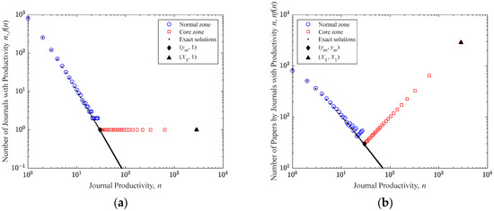 Estimating journal productivity of the core region involves determining the journal count and the paper count first. Since Figure 1 shows a close match between the journal number and the paper number in the normal region, the total journal count and the total paper count of the normal region can be directly obtained by summing all journal and paper numbers. These are calculated as and , where is the journal productivity when . In this context, can be seen as the productivity of the most productive journal in the normal region, as indicated by the black diamond in Figure 1. According to Equation (1), the analytical expression for can be derived as: