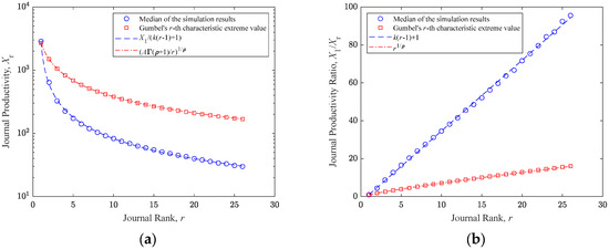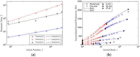 Comparisons of the theoretical and numerical results: (a) number of journals with productivity ; (b) number of papers produced by journals with productivity .