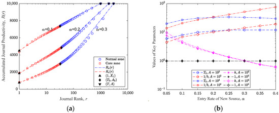The Bradford curves for the constant entry rate scenario are shown in Figure 4a. Here, the red squares and blue circles represent the simulation results for the core and the normal regions, respectively, while the red dashed lines and the blue dotted lines represent the theoretical results of Equations (8) and (13). The key points , , and are also shown as the black upper triangle, the diamond and the lower triangle in Figure 4a. It is notable that although the core region contains far fewer journals than the normal region, its representation is significant due to the x-axis’s log scale. Consequently, journals with lower ranks are better represented in Figure 4a.