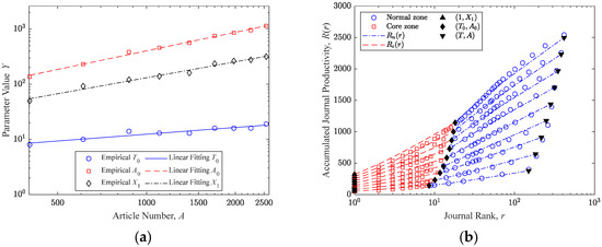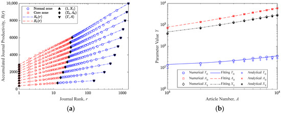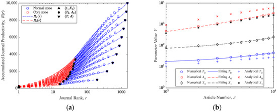where is the only parameter waiting to be determined. The validity of this equation is supported by Figure 2b, where the blue circles represent the simulation results, and the blue dashed lines show the linear fitting results. Hence, the productivity of the -th most productive journal can be derived from Equation (7), and the cumulative productivity of the first most productive journals can be written as:
