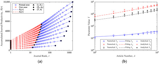 where the constants and are functions of . Since is approximately one, and can be considered constants. The close match between the analytical and the numerical results confirms the validity of Equations (3), (4) and (6). The analytical result for is slightly lower than the numerical ones because, in the numerical results, all journals with productivity that satisfy are considered part of the core region; whereas, in theory, some of them belong to the normal region.