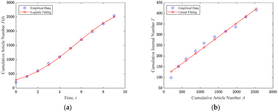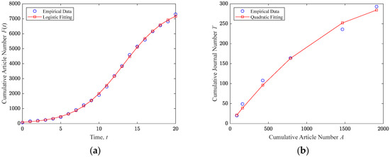 Next, quadratic fitting (Equation (20)) was applied to the journal and article pairs to estimate the total number of journals and the entry rate of new journals , as shown in Figure 10b. Logistic fitting was applied to better capture the effect of a linearly decreasing journal entry rate, providing a more accurate representation of how new journals enter the system as article output increases.