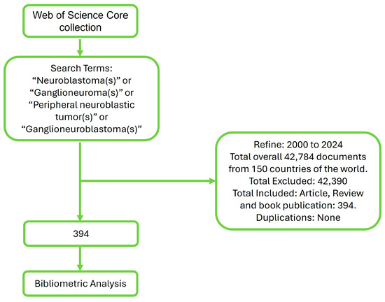Peer-reviewed scientific publications metadata connected to African neuroblastoma research were extracted from the Web of Science™ Core Collection Database (Clarivate Analysis, Boston, MA, USA) on 16 July 2024. Only English-language literature was included and all authors searched, reviewed and checked the found literature. The search terms used were “neuroblastoma(s)” or “ganglioneuroma(s)” or “peripheral neuroblastic tumor(s)” or “ganglioneuroblastoma(s)”. Publications issued from the year 2000 to 2024 were extracted using key metrics of publication number, citations, h-index, sustainable development, research area, and funds. Reviews, books, reprints, meeting abstracts, letters, proceeding papers, editorial material, early access, publication news, retracted data paper expression of concern publications, and biographical-items were excluded. Language restrictions were not obligatory. Moreover, in the context of this study, the excluded criteria comprised of publications wherein the majority of the authors or collaborators are non-African.