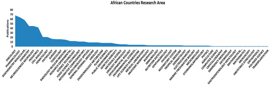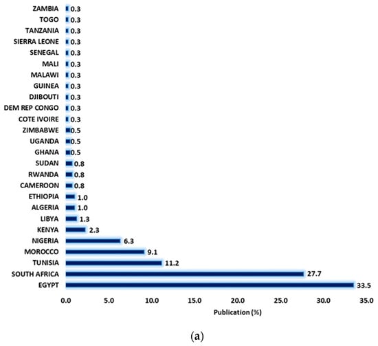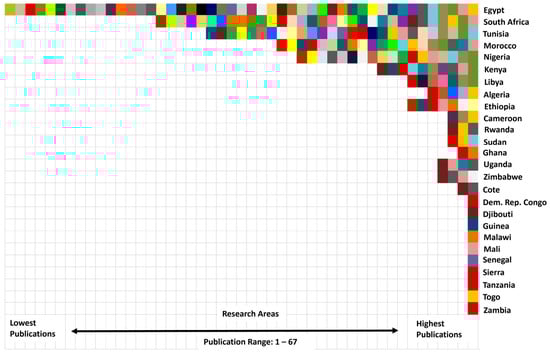Moreover, there is a large degree of inevitable involvement of Egypt (n = 47 RA), South Africa (n = 33 RA), Tunisia (n = 27 RA), Morocco (n = 21 RA), Nigeria (n = 18 RA), Kenya (n = 10 RA), Libya (n = 7 RA), Algeria (n = 5 RA, Ethiopia (n = 7 RA) in more/equal to five (≥5) different research areas. Incomparable to Cameroon (n = 3 RA), Rwanda (n = 3 RA), Sudan (n = 3 RA), Ghana (n = 2 RA), Uganda (n = 4 RA), Zimbabwe (n = 4 RA), Cote Ivoire (n = 2 RA), Democratic Republic of Congo (n = 1 RA), Djibouti (n = 1 RA), Guinea (n = 1 RA), Malawi (n = 1 RA), Mali (n = 1 RA), Senegal (n = 1 RA), Sierra Leone (n = 1 RA), Tanzania (n = 1 RA), Togo (n = 1 RA) and Zambia (n = 1 RA), which are involved in less than five research areas (Figure 5).