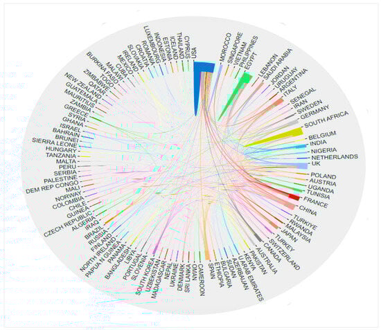 The UTF-8 format metadata were imported in “full record and cited reference” format into the bibliometric online analysis platform (http://bibliometric.com, accessed on 16 July 2024) for collaborative relationship analysis between countries/regions. Variables were expressed as sum and percentage. The citation average was expressed as mean ± SD. Their bibliographic data was downloaded and converted into an MS Excel spreadsheet for visualization analysis and statistical analysis. Statistical analyses were performed with GraphPad Prism v. 10.2.3 (GraphPad, La Jolla, CA, USA). The Pearson correlation coefficient (r) was used to test correlations between the number of research publications and awarded funds per African country. The closer the r was to +1 or −1, represented the higher the correlation between the two variables. A paired t-test was used and p-values of >0.05 were represented as statistically significant. R2 or the coefficient of determination expresses how well the data fit the regression model.