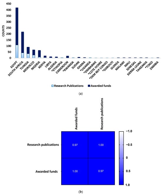 Correlational data of neuroblastoma research Africa: (a) Trends of correlations between research publications and awarded funds per African country; (b) Pearson correlation of research publications and awarded funds. Key: * No awarded funding.