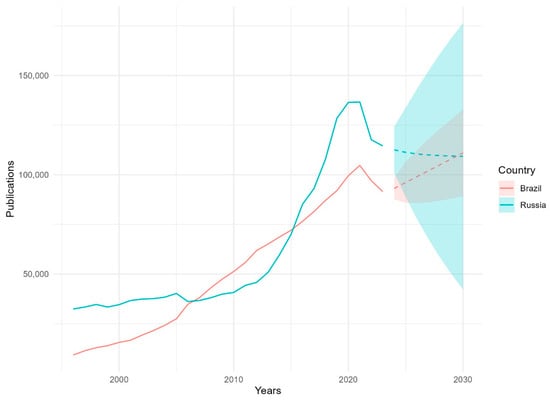 Cicero, T. Forecasting the Scientific Production Volumes of G7 and BRICS Countries in a Comparative Analysis. Publications 2025, 13, 6. https://doi.org/10.3390/publications13010006