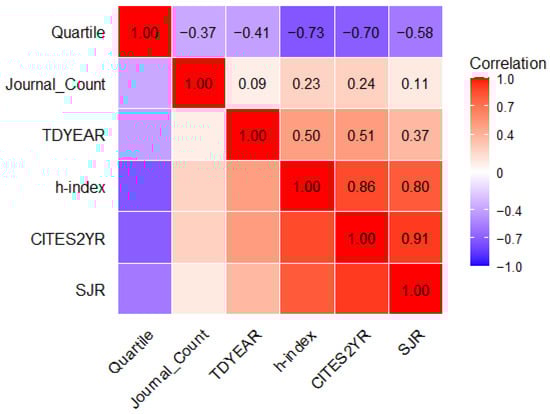 The correlation analysis (Figure 2) examines the relationship between publisher volume (Journal_Count) and journal impact metrics. Journal_Count exhibits weak positive correlations with h-index (0.24) and CITES2YR (0.11), indicating that while larger publishers tend to manage more journals, their direct influence on citation-based metrics is limited. TDYEAR (0.09) also has a weak correlation with publisher volume, suggesting that the number of journals a publisher produces is associated with variations in publication output rather than citation impact. Publisher volume has a moderate negative correlation with quartile (−0.37), meaning publishers with more journals tend to have a higher proportion of journals in top quartiles. Stronger correlations appear among citation-based metrics, with h-index and CITES2YR (0.86) and SJR (0.80) showing strong associations, reinforcing the interdependence of citation indicators. Quartile rankings also show negative correlations with h-index (−0.73), CITES2YR (−0.70), SJR (−0.58), and TDYEAR (−0.41), confirming that journals with higher impact metrics tend to be ranked in higher quartiles. These correlations highlight the interconnectedness of citation-based measures but provide a limited perspective on the broader factors influencing journal rankings. The weak association between citation-based metrics and publisher volume suggests that journal impact is shaped by additional structural factors beyond the scale of journal production. Further analyses, including categorical tests and mixed-effects modeling, offer a more comprehensive evaluation of the determinants of journal performance.