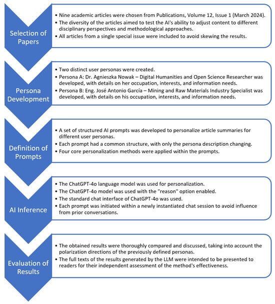 The methodology employed in this study, the flow of which is visually represented in Figure 1, was designed to assess the ability of AI-generated content to adapt to the needs of diverse academic and professional users. This section provides a comprehensive overview of the process, beginning with a selection of scientific articles, followed by the creation of distinct user personas, the definition of AI prompts tailored to their expectations, and the implementation of AI models for content generation.