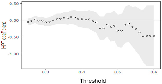 Estimates of the coefficient of hazard perception ability (HPT coefficient, on the y-axis) as a function of the threshold for braking intensity (threshold, on the x-axis). The black horizontal line represents a zero coefficient. The gray area represents the confidence intervals.