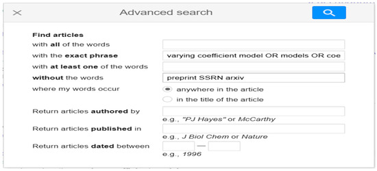 Google Scholar was used to obtain a crude estimation of the total number of publications with the VCM. The search was conducted by first typing “varying coefficient OR coefficients” into the field “with the exact phrase” within the advanced search dialog box (see Figure 2 below). The second step was tick marking the filter option “anywhere in the article”, and finally, the third step was typing in the words preprint, SSRN, and arxiv in the field “without the words” to exclude papers that were not published yet.