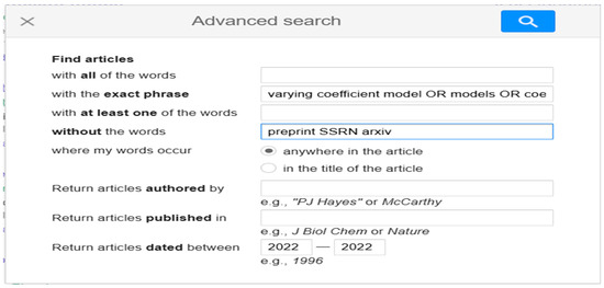 Figure 4. Advanced search box for publications with the phrase “varying coefficient model OR models OR coefficients” in 2022.